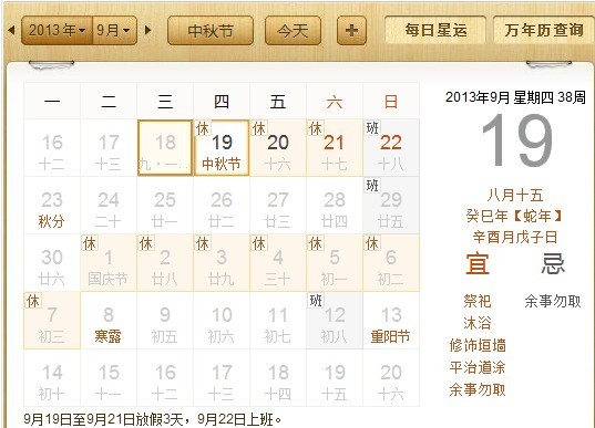 2013年9月19日至9月21日放假,共3天。其中9月19日(星期四,农历中秋节)法定节假日,9月21日(星期六)公休日,9月22日(星期日)公休调至9月20日,9月22日(星期日)照常上班。